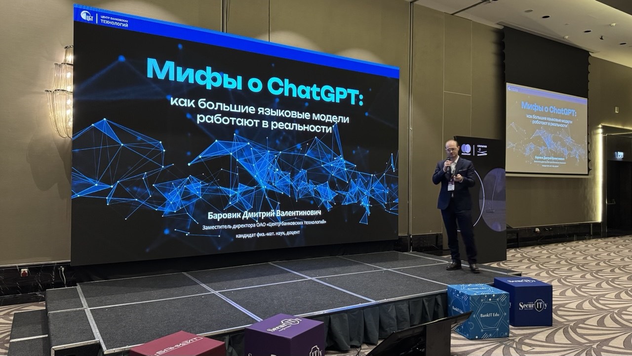 У рамках секцыі “Вялікія дадзеныя і штучны інтэлект”, Дзмітрый Баравік, намеснік дырэктара Цэнтра банкаўскіх тэхналогій, падзяліўся экспертнай думкай па тэме “Міфы аб ChatGPT: як вялікія моўныя мадэлі працуюць у рэальнасці”. Ён акцэнтаваў увагу на распаўсюджаных памылках аб магчымасцях моўных мадэляў, такіх як ChatGPT і падрабязна разабраў іх рэальныя прымянення ў банкаўскай сферы.