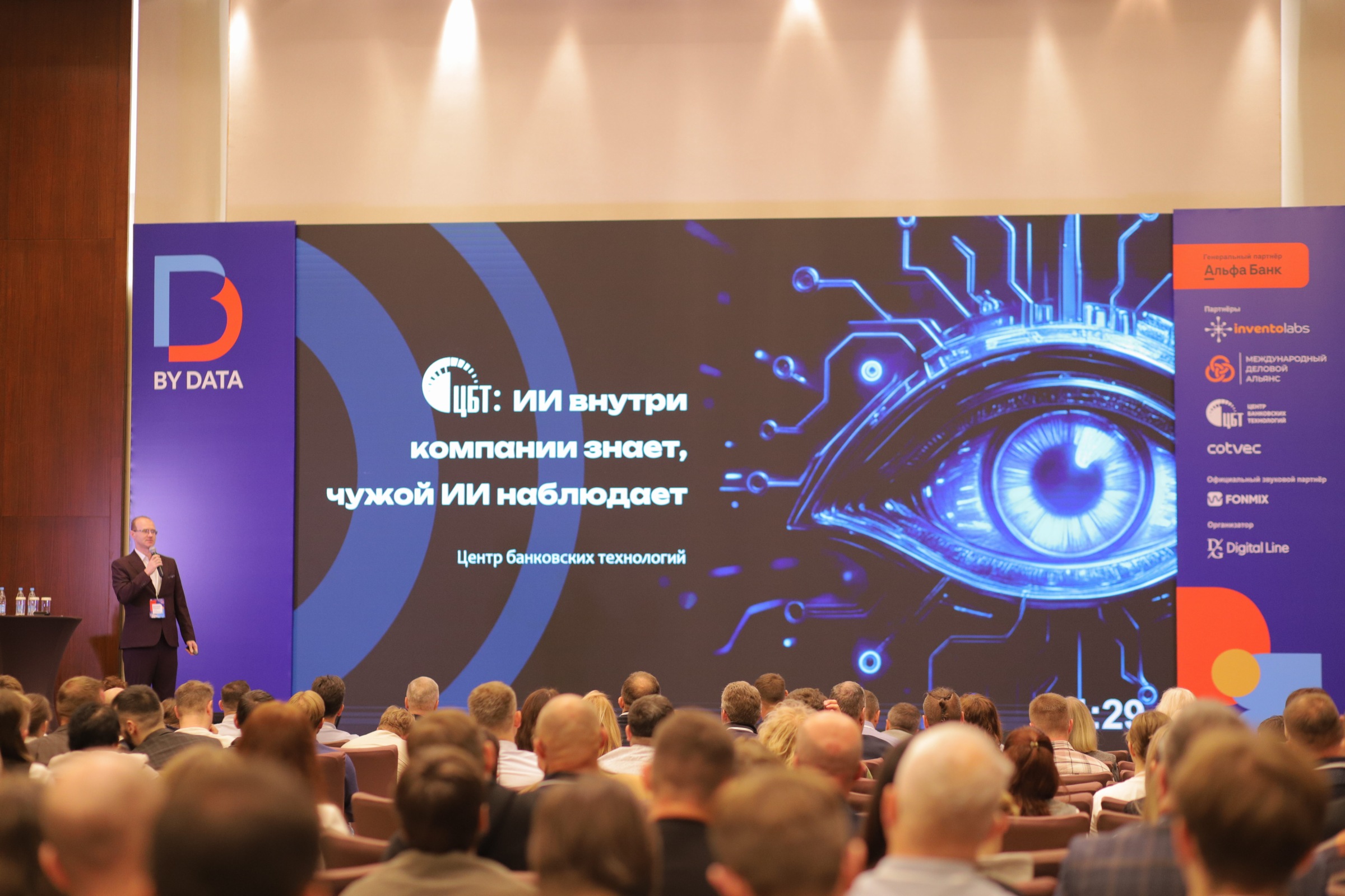 Спикером от ЦБТ выступил заместитель директора, кандидат физико-математических наук, доцент — Дмитрий Баровик. Он выступил с презентацией на тему «ИИ внутри компании знает, чужой ИИ наблюдает».